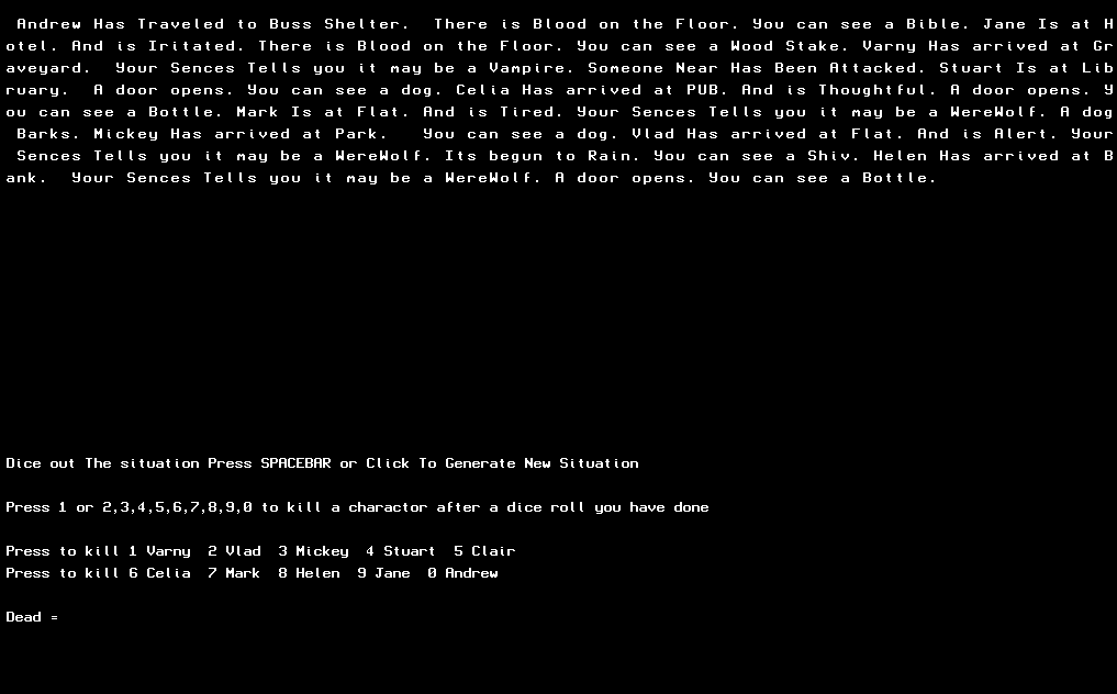 This is for Solo or Multiplayer RPGs Of Vampire WereWolves , You Know the kind. it Generates situations that all link together as a story. you can kill off charactors as the dice rolls effect the story, so its interactive, and uses your Rules from Vampire RPGs